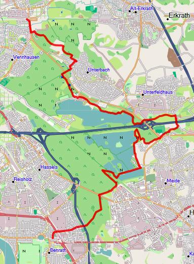 | Strecke: | abwechslungsreiche Wanderung mit wenigen Steigungen über die Gerresheimer Höhen zum Unterbacher See und Elbsee nach Benrath |
